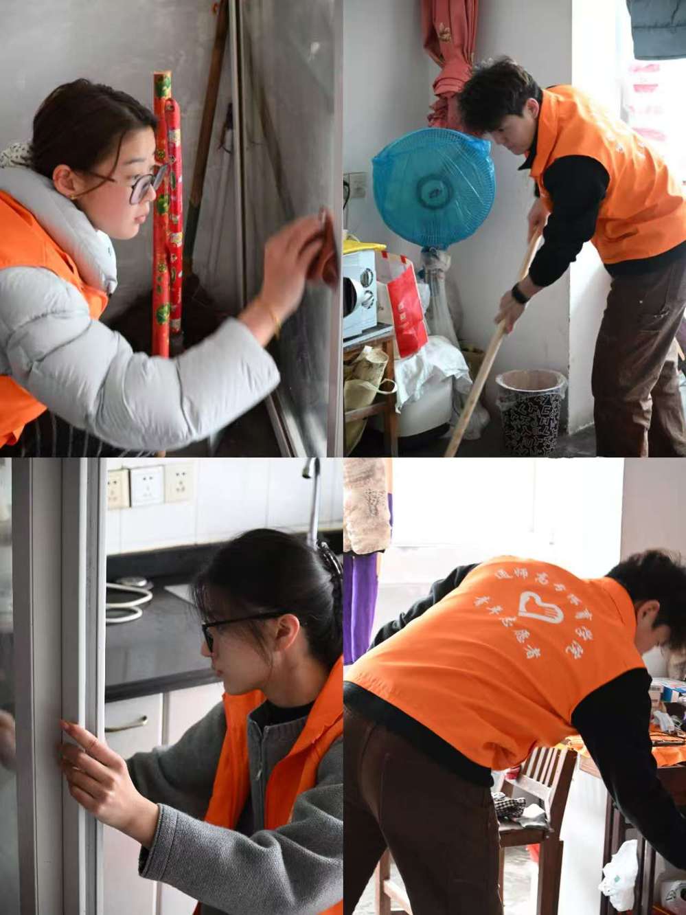 活动中,志愿者们分为两组同步开展服务。第一组深入社区独居老人家中,开展暖心慰问与卫生清洁。大家分工协作、认真细致,擦门窗、整理衣物、清扫房间,将老人居所打扫得干净整洁。志愿者们与老人亲切交谈、嘘寒问暖,用贴心行动传递关怀,让独居老人倍感温暖。